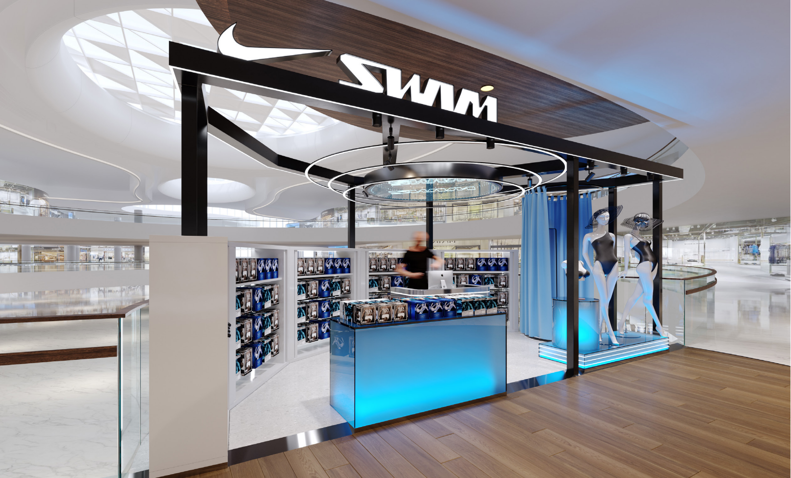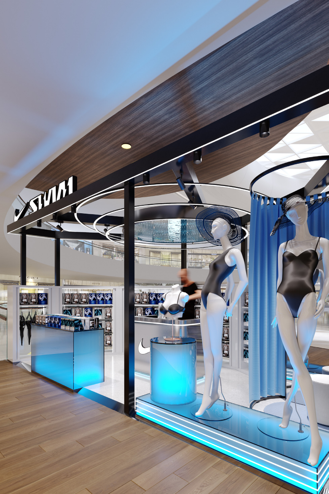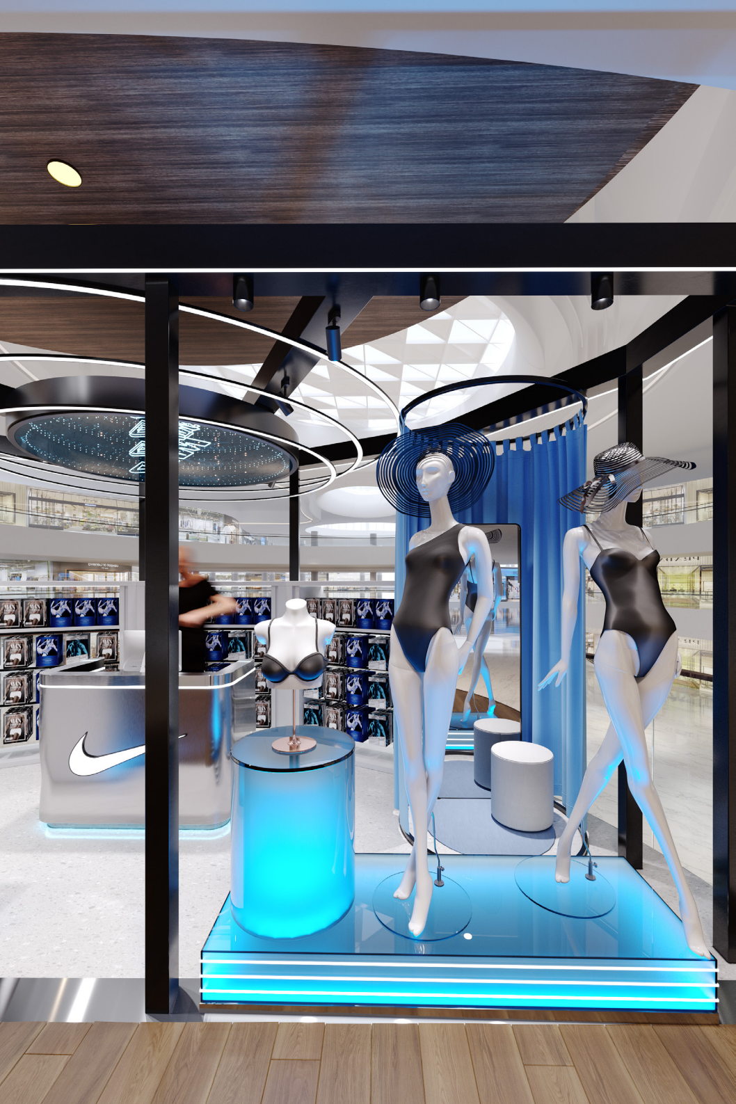 In this NIKE swimwear KIOSK design, we embraced futuristic technology and aqua aesthetics as our core concepts, perfectly blending the fluidity of water with the technical innovation of sportswear. The space transcends being a static container, instead becoming a three-dimensional experiential field that extends the product’s spirit – allowing visitors to viscerally perceive speed, agility, and the poetry of water.