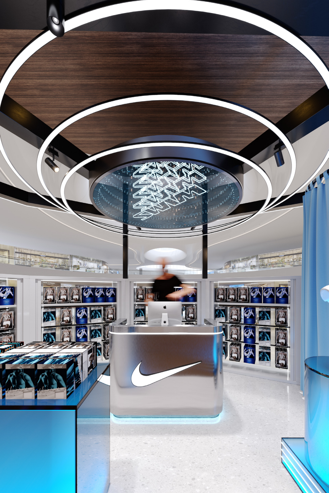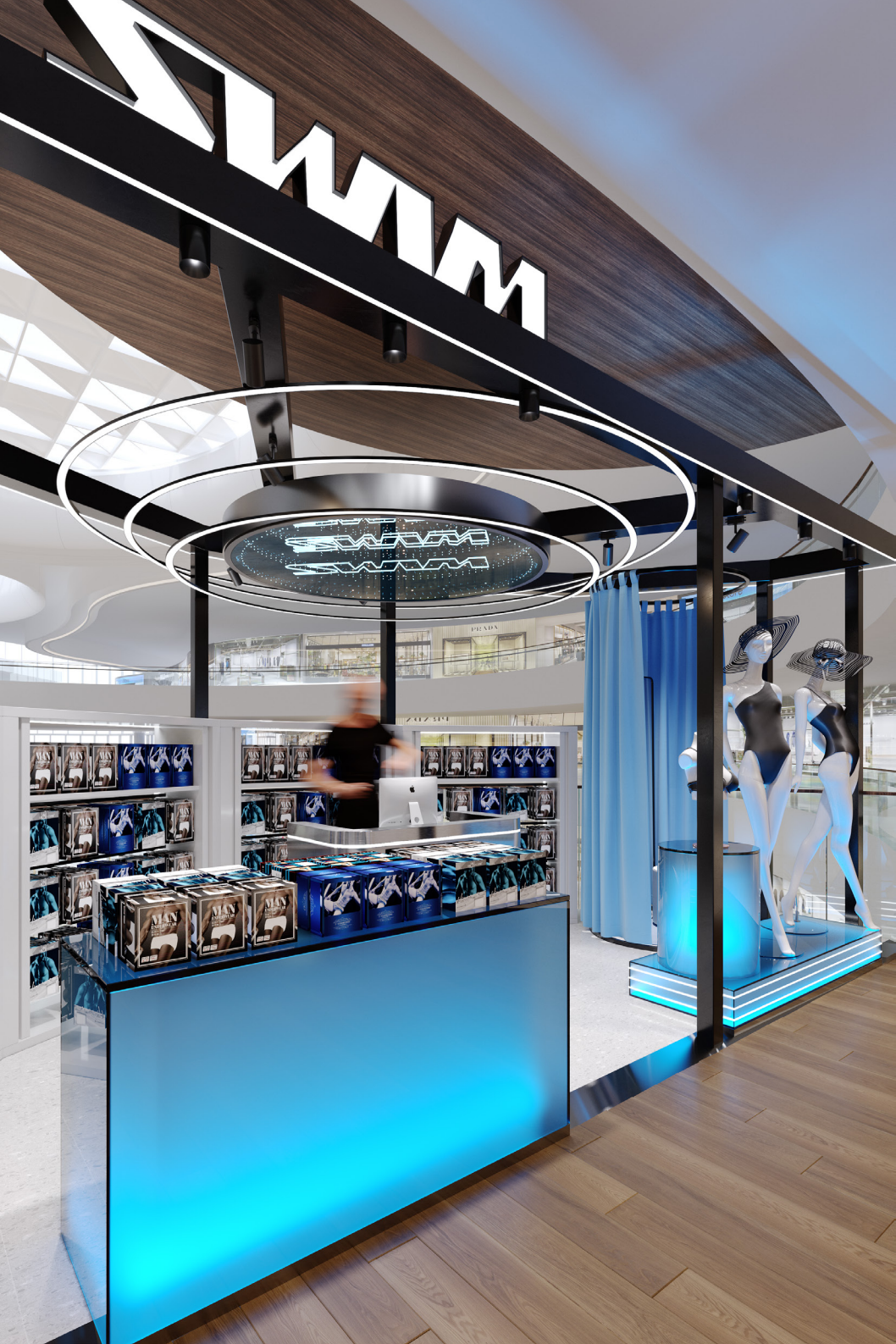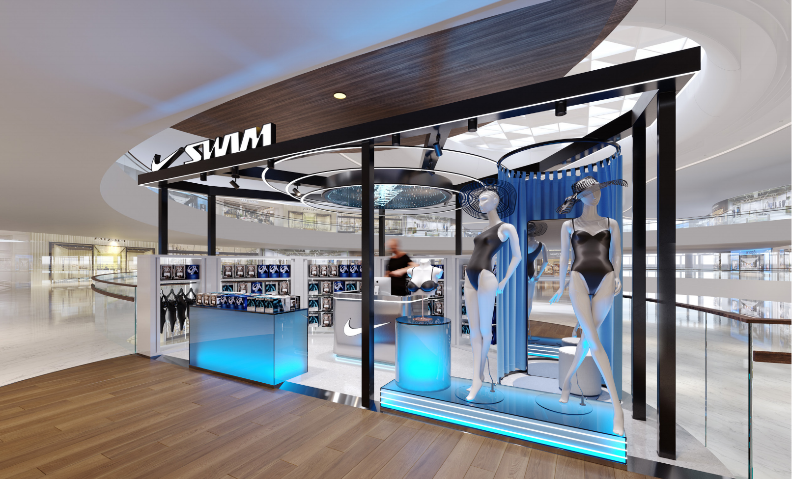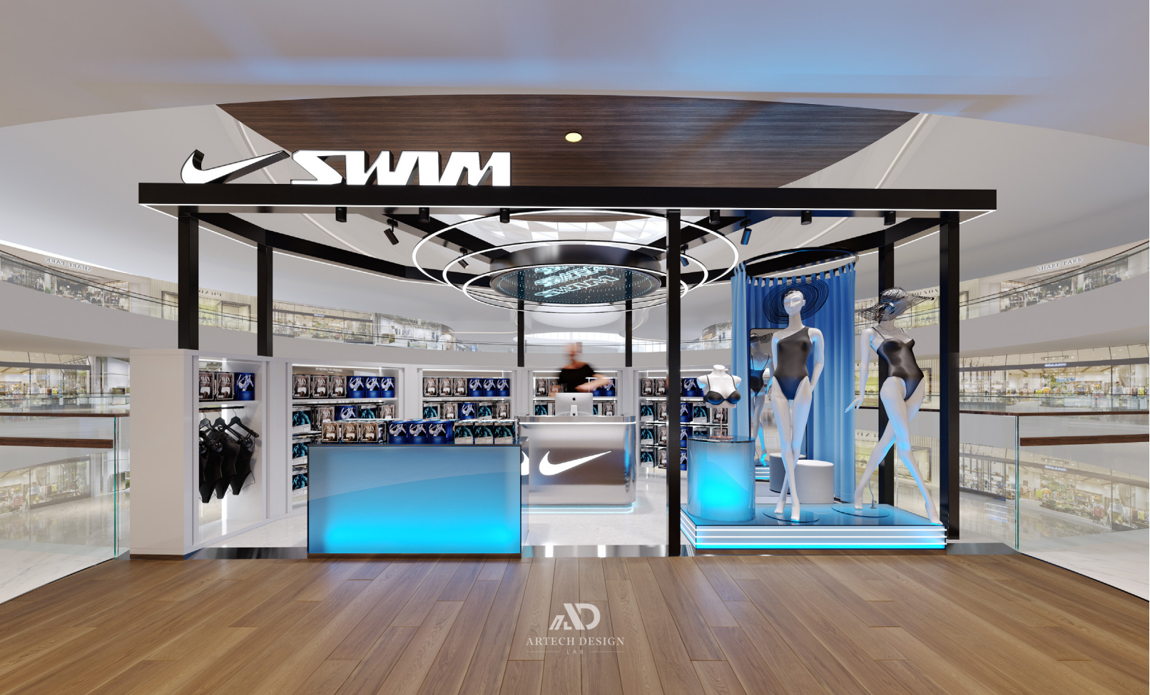 In this NIKE swimwear KIOSK design, we embraced futuristic technology and aqua aesthetics as our core concepts, perfectly blending the fluidity of water with the technical innovation of sportswear. The space transcends being a static container, instead becoming a three-dimensional experiential field that extends the product’s spirit – allowing visitors to viscerally perceive speed, agility, and the poetry of water.