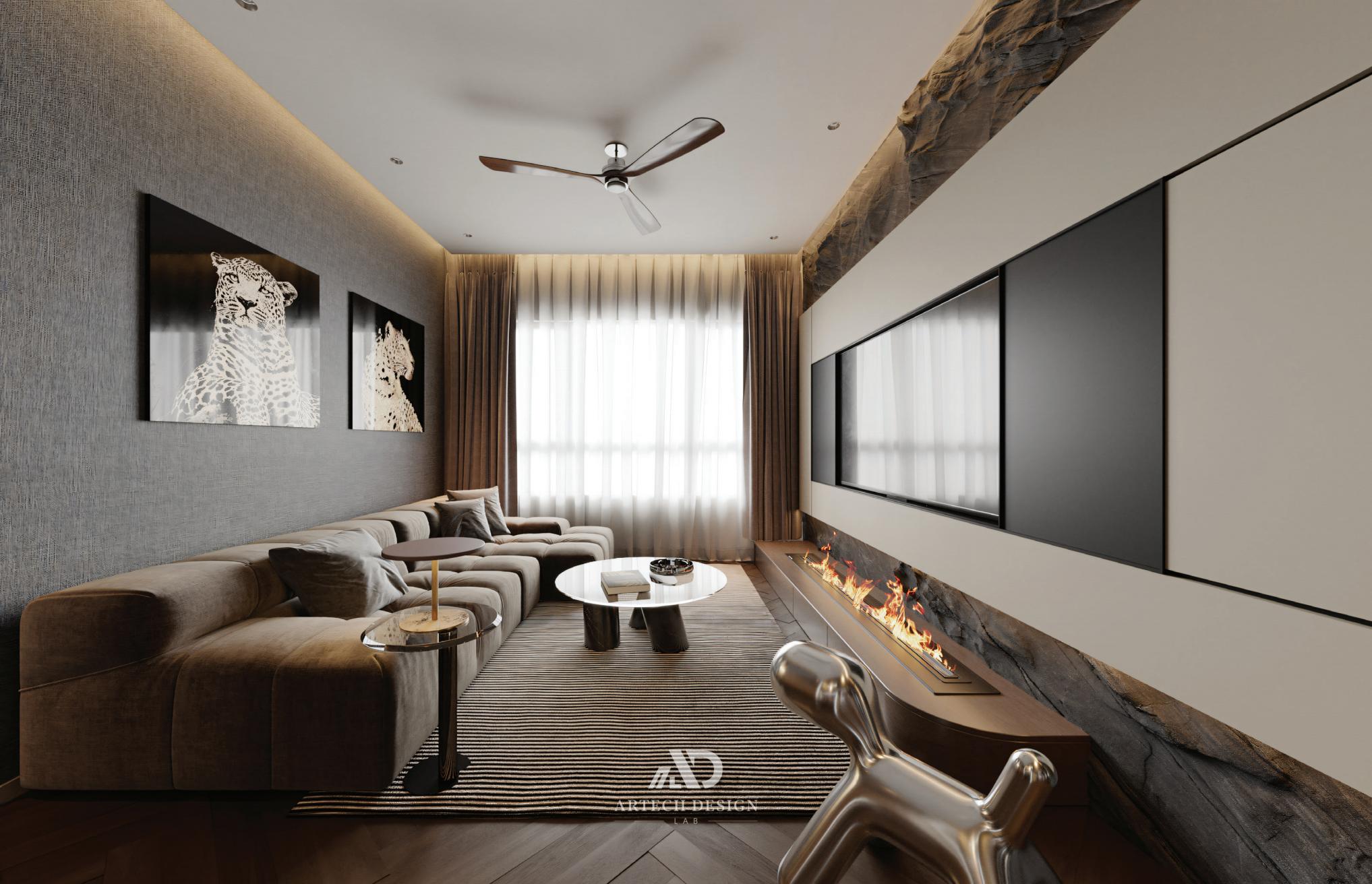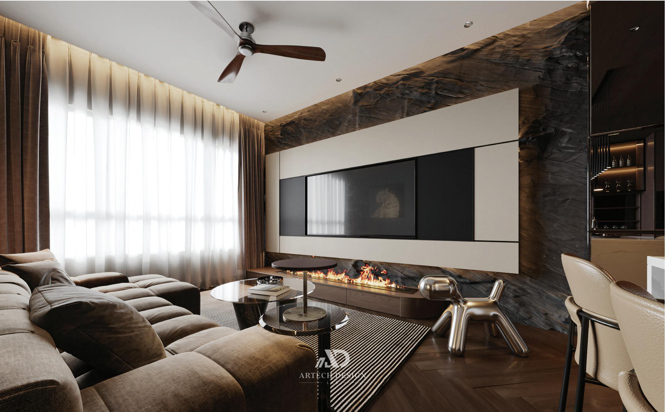 岩石质感的主墙面成为空间的视觉焦点,为客厅注入原始而深邃的力量,而干净利落的内嵌柜体与嵌入式壁炉则在视觉上营造出平衡与温馨。