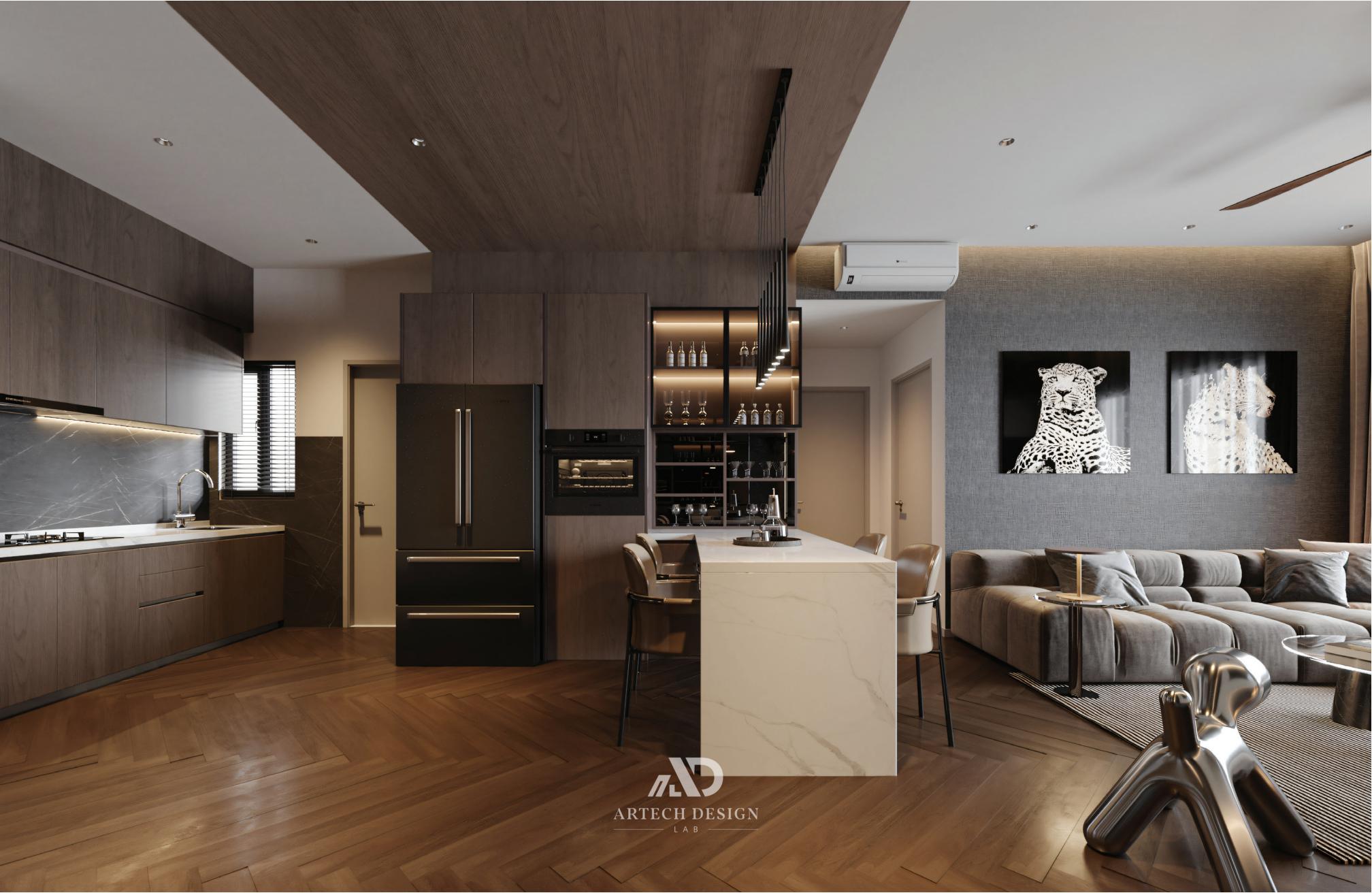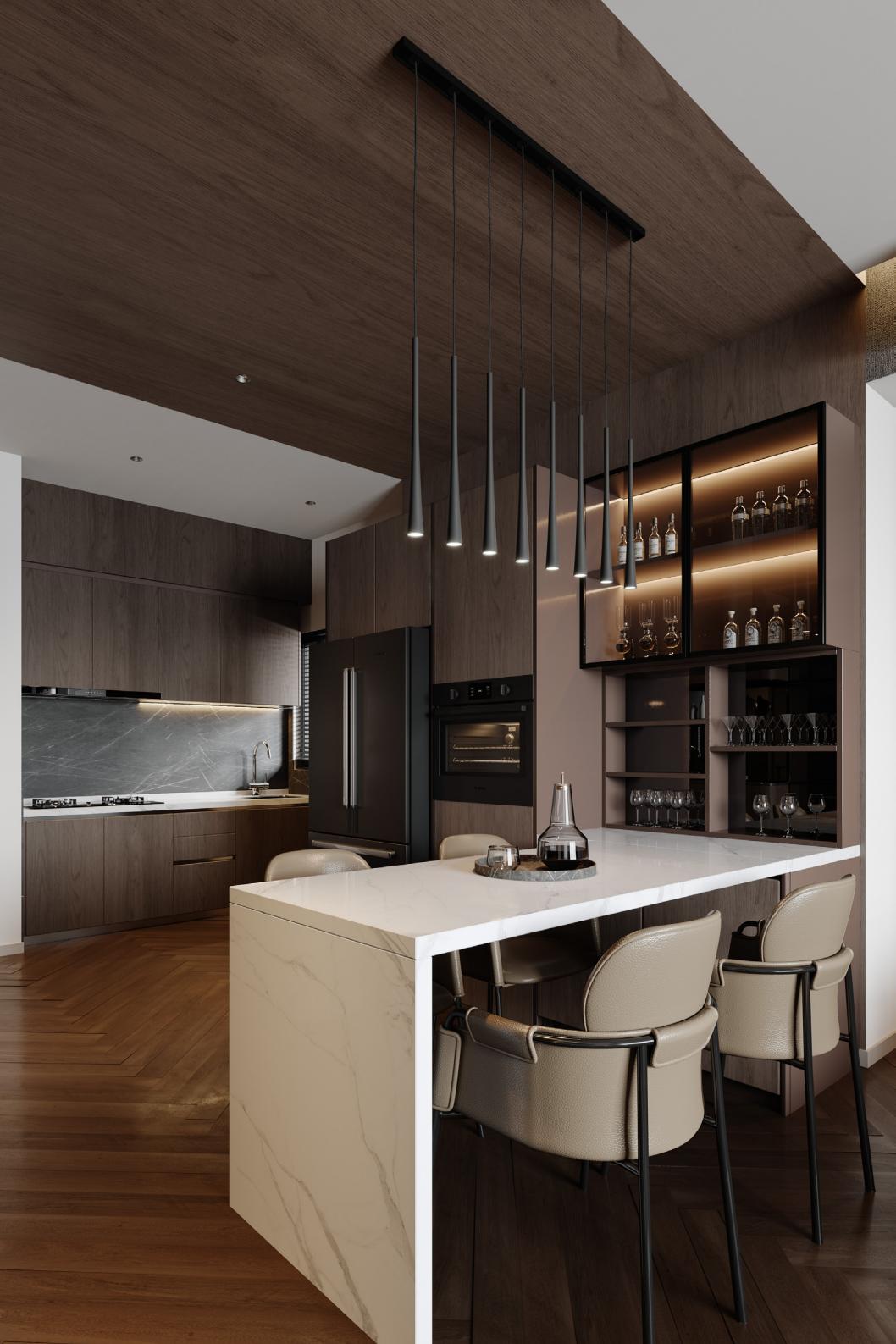 开放式的格局自然衔接从舒适的起居区延伸至用餐区,整体以中性色调、柔和灯光及温润木质饰面贯穿,形成和谐统一的空间氛围。