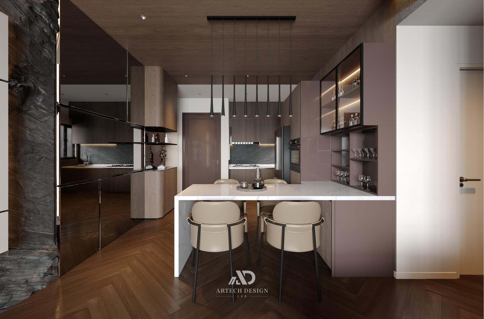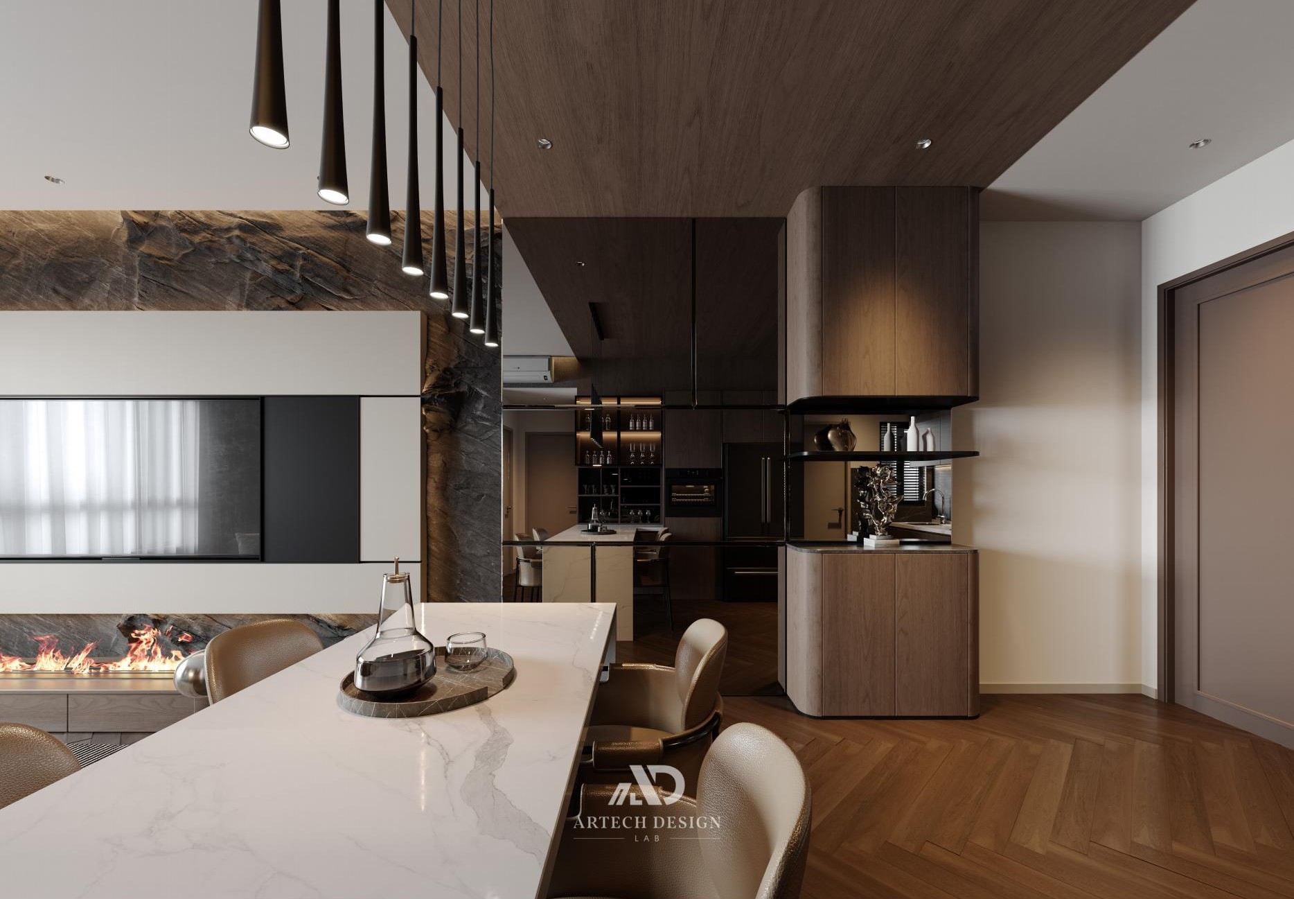 踏入这个空间,仿佛进入一个现代优雅与自然温暖交织的生活境界。整个室内设计以对细节的极致追求为基础,将大胆的材质运用与精致的质感完美融合。