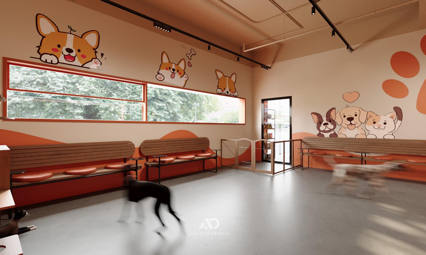 Step into a playful and inviting pet retail & grooming store, where vibrant color, smart layout, and charming character design come together to create a joyful space for pets and their humans alike. The interior features a warm, welcoming palette of orange and cream tones, brought to life with soft ambient lighting and cheerful wall illustrations of paw prints and adorable pups.